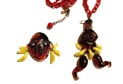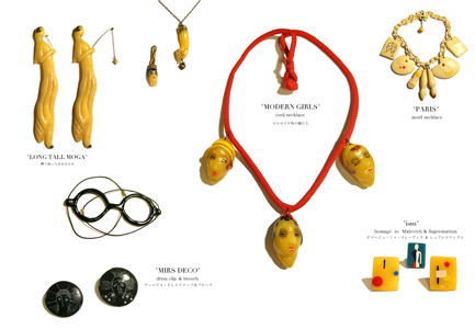 20世紀初頭のヴィンテージ&アンティークを愛する人間が、「当時に生きていたら」という感覚で アンティーク・ファッションに合わせてひとつひとつデザイン・制作しています。 1920's〜1940's の世界、ユーモア溢れるプラスティックジュエリーをご堪能ください。
