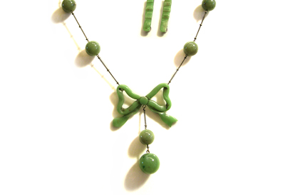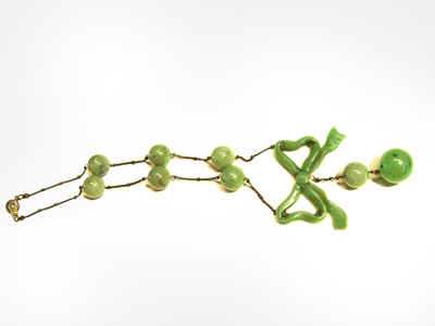 ~1920's Vintage Style Bow Necklace. アールヌーボー~アールデコ期を象徴するモチーフ型をつくり、ビンテージ・ビーズと色味を合わせたボウを一つ一つ制作した。