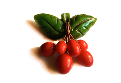1930年代〜1940年代ファッションのための 葉っぱとフルーツのブローチ。実はヴィンテージものです。 1930's〜1940's Bakelite Style.
