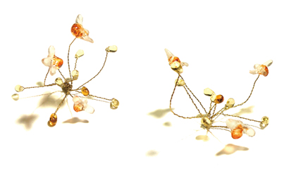 ミツバチが顔の周りを飛んでいる。 弾ける蜜の煌めきはガラスパーツ。 細い真鍮線の不完全なラインが、アンティークの枯れた雰囲気を生み出しています。