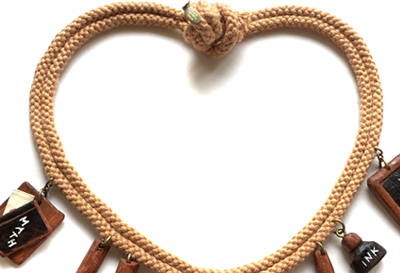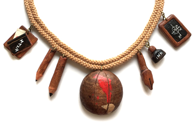 手彫刻とペインティングで仕上げた、ウッドチャームのスクール・コード・ネックレス。教科書の間にはラブレターが。1940s Vintage Style.